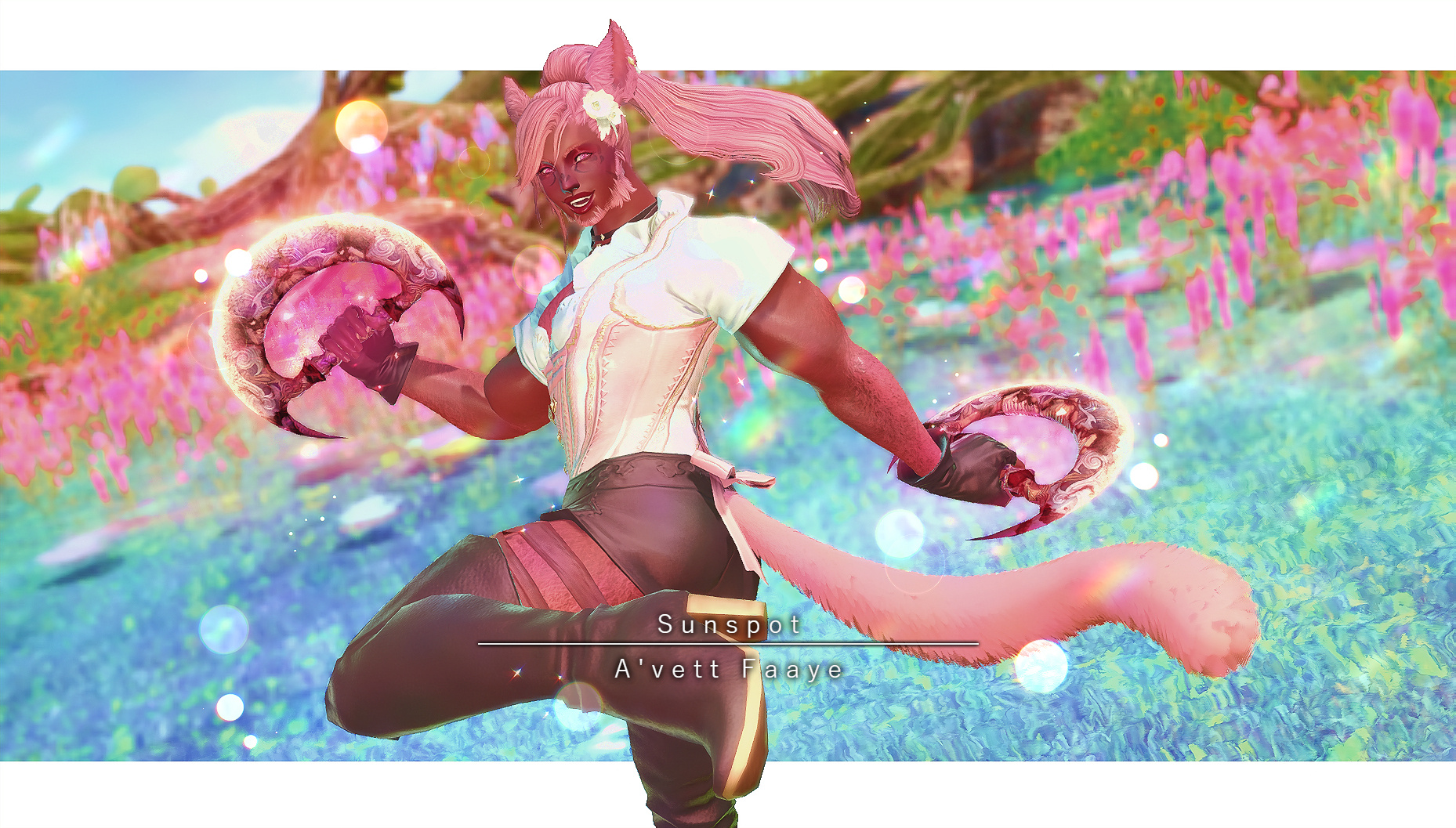 A personal combo class between MNK and DRK, the SUNSPOT manifested as a direct result of A'vett's journey pursuing the strength to dutifully protect others as a Dark Knight.Shortly post-STB, A'vett became unable to rest mulling over his maddening encounters with Zenos. Fearful that his strength would not be enough — both to protect those dear to him and to prevent his blind rage from reducing him to a violent, destructive beast, A'vett returned to his Free Company's city state; Ishgard. There, he spent his time roaming land and city in quiet trepidation, pondering a method in which to contain and control his rage, before stumbling across Fray Myste.His tale closely follows the canonical DRK questline, with the exception of one crucially altered element;