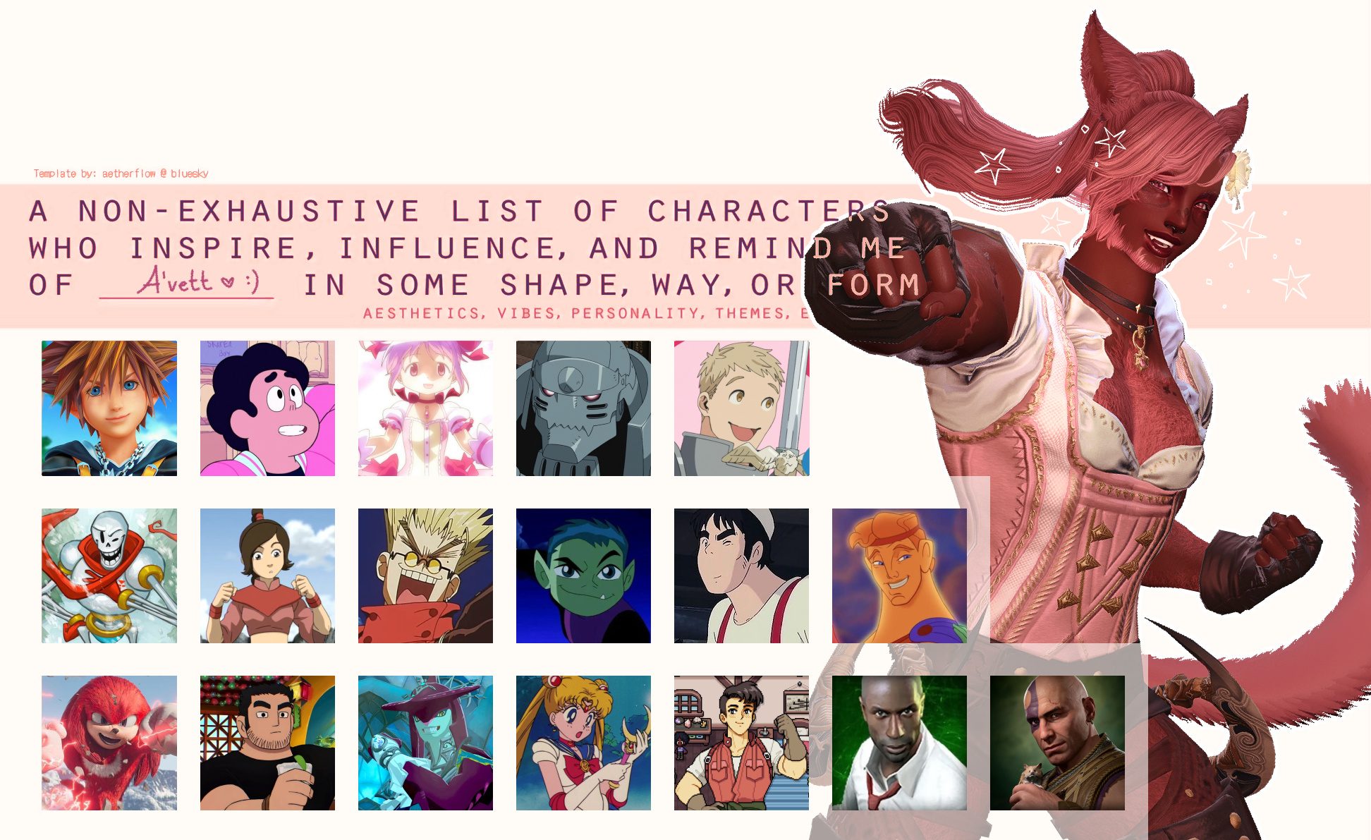 I've been playing FFXIV casually since '20 and having tons of fun building on A'vett.My experience RPing anything FFXIV related is limited & I work full-time in psychiatry, so I'm only online here-and-there. Please be patient!Feel free to reach out to me in-game or through Bluesky DMs! I would love more opportunities to roleplay A'vett!